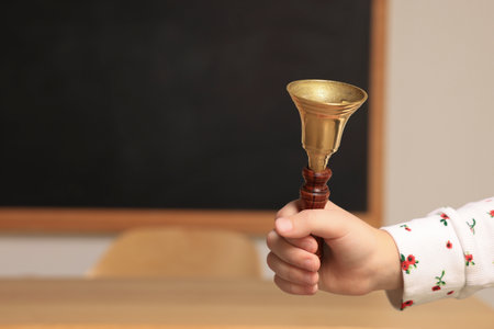 Pupil with school bell near desk and chalkboard in classroom, closeup. Space for text