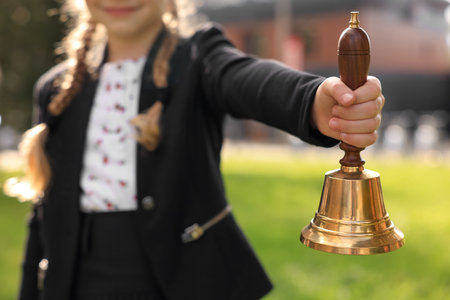 Closeup view of pupil holding school bell outdoors on sunny day
