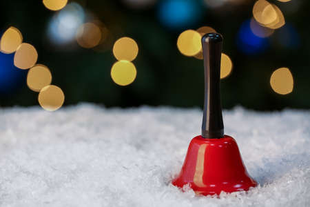 Red Christmas bell on snow against blurred lights