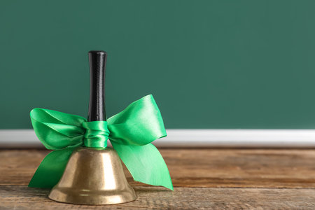 Bell with ribbon on table against green background. End of school