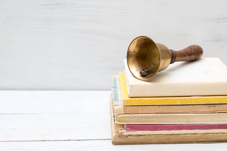Old books and a vintage school bell. Education concept