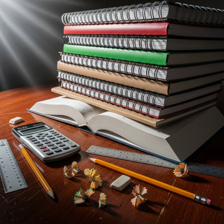 A desk filled with open textbooks, notebooks, pens, and pencils, creating a studious environment ideal for tutoring or learning.