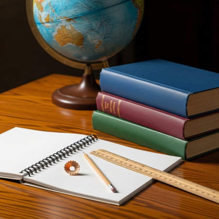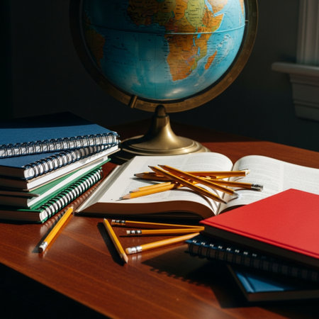 A well-organized desk with open textbooks, notebooks, pens, and pencils, perfect for tutoring or educational settings.