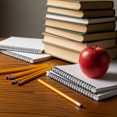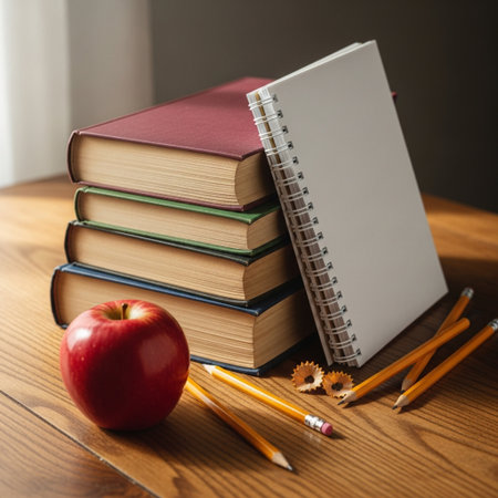 A vibrant red apple sits next to notebooks and colorful pencils on a rustic wooden desk, representing education and creativity in a study environment.