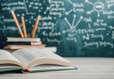 An open book displaying study notes rests on a wooden table, while a chalkboard filled with diagrams and equations is in the background, indicating an active learning environment.