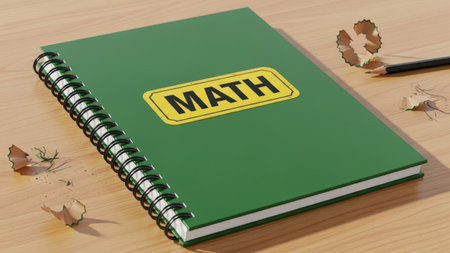 A vibrant collection of colored pencils stands in a holder beside an open book and neatly stacked textbooks, with a chalkboard filled with numbers and notes in the background.