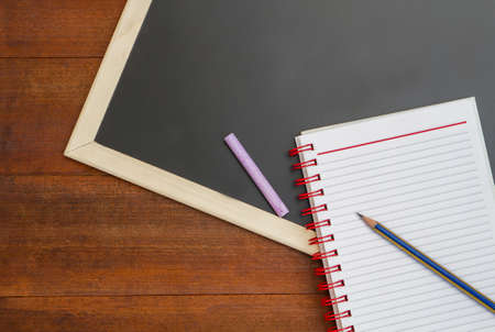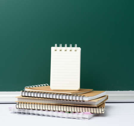 blank green chalk school board and stack of notebooks, back to school, copy space