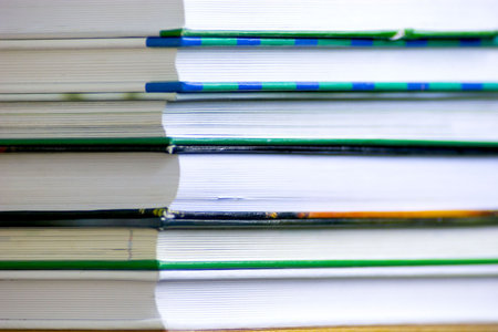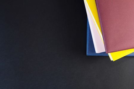 Stack of multicolored books on yellow surface background with copy space for text. Teacher's Day concept, Knowledge, literature ,reading, erudition concepts