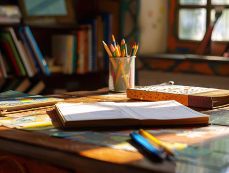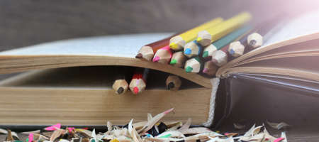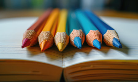 Colorful pencils on an open book, symbolizing creativity and education. Generate AI