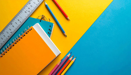 A copy space image of an empty notebook photographed from a top down perspective on a bicolor background