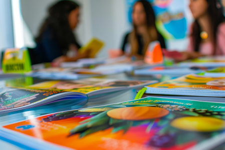 A group of people are sitting around a table with a variety of colorful books. The books are arranged in a way that they are all facing the same direction, and the people are looking at them