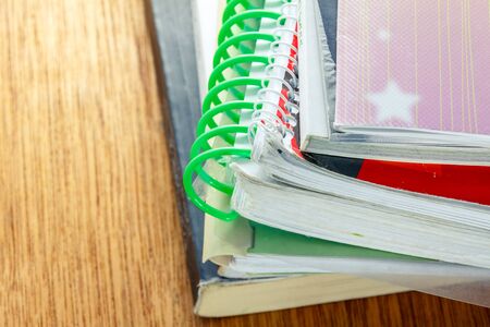 Stack of colored books with stationery stuff on wooden table, selective focus