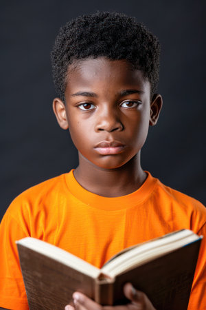 A young boy, engrossed in a book about Black history during February, leans forward, eyes wide with wonder and curiosity He's surrounded by colorful illustrations and text, capturing the essence of learning and discovery during Black History Month This heartwarming image embodies the importance of education and celebrating Black heritage AI Generative