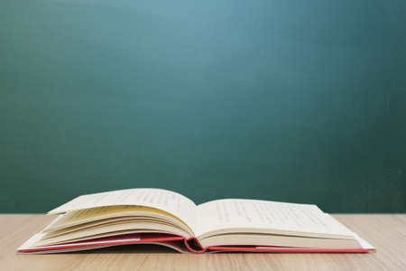 Vintage Book Open with Plant Sprout on a Classroom Desk with Chalkboard in Background