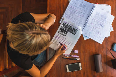 Top view of unrecognizable girl doing homework sitting at a desk in her bedroom