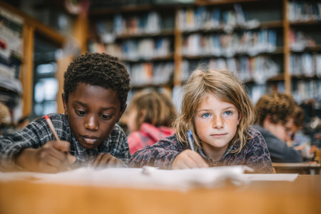 Young African American boy and Caucasian girl focused on their creative tasks at a library table, with shelves of books in the background, promoting education and teamwork