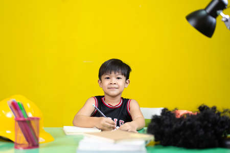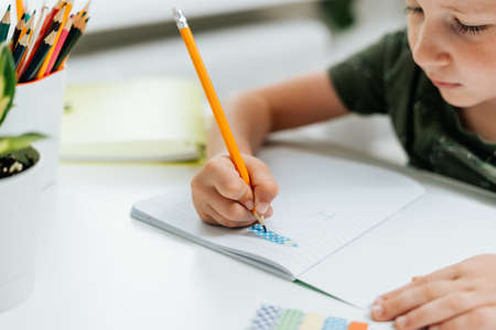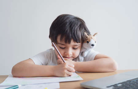 Kid in self isolation siting with notebook on table doing homework,Happy Child boy writing or drawing on white paper, Elementary school and home schooling, Distance Education,E-learning online concept
