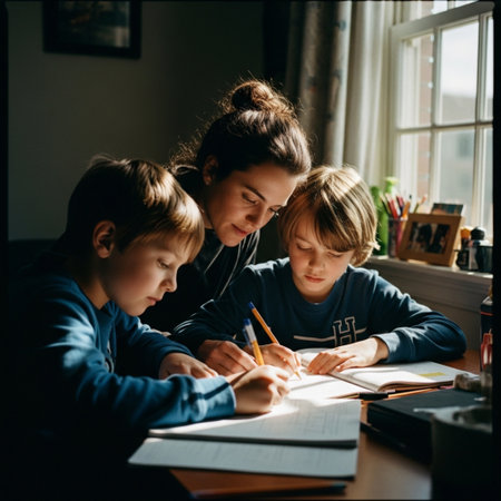 Older sibling patiently helps younger sister with challenging math homework in a sunlit, cozy study