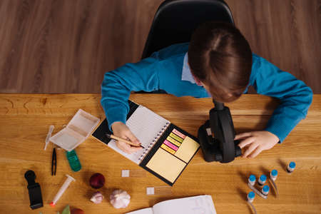 Distance online education, internet learning. First grade boy studying at home using microscope, making notes, biology online lesson