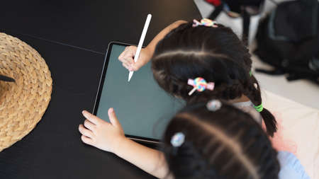 Overhead shot of two girls drawing on mock up digital tablet with stylus pen in living room