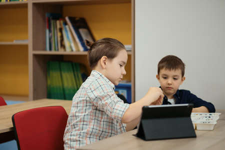 Two kids of different age choose parts of robotic electric toys for building robots at robotics school lesson.