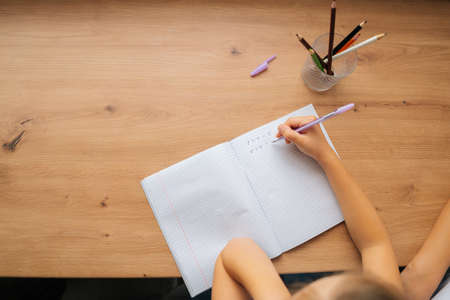 High-angle view of unrecognizable elementary little child girl doing homework writing in copybook with pen sitting at table. Close-up cropped shot of primary little school girl learning at home.