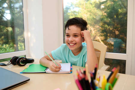 Happy Caucasian schoolboy, student of primary educational establishment, smiling a cheerful toothy smile while doing homework. Knowledge. Online Education. Back to school. New academic year semester.