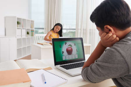 Concentrated boy doing homework while e-learning