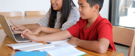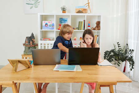 Boy and girl studies at home and doing school homework. Distance learning online education.