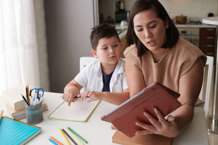 Young boy doing his school homework with his mother, at home, he is writing on a book. Distance education. Elementary school and home schooling, Distance Education concept