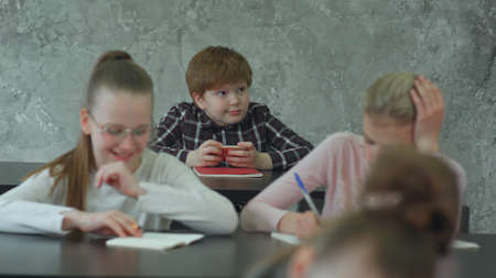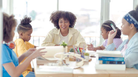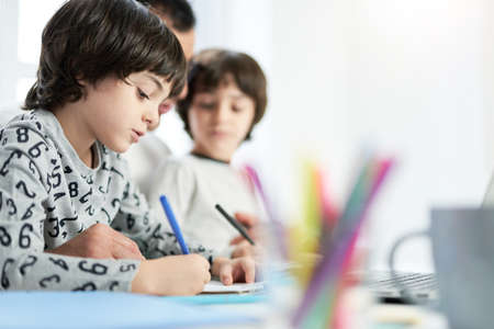 Student in international preschool writing a book together in Elementary School Class, Pupils enjoying studying in classroom.