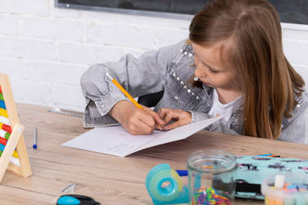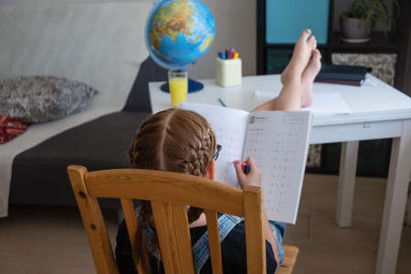 girl doing homework at home table solving math assignments, homeschooling by the light of the lamp, child doing lessons in a notebook at the desk in the home room