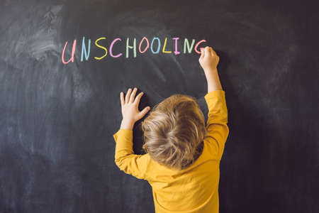 Homeschooling. Child pointing at word Homeschooling on a blackboard.