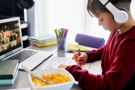 Side view of schoolboy during homeschooling in his room