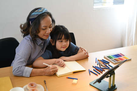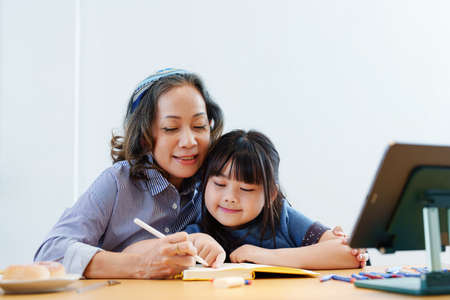 Asian portrait, grandchild granddaughter grandma grandmother and granddaughter happily join in activities to enhance skills for grandchildren.