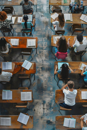 Top view of classroom with desks and school children sitting and studying.