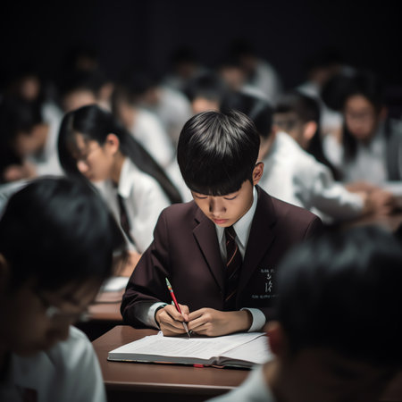 Generative AI : A close up isolated students hand holding a pen writing during class exam or lesson time at school Bright colors and second student blurred in the background