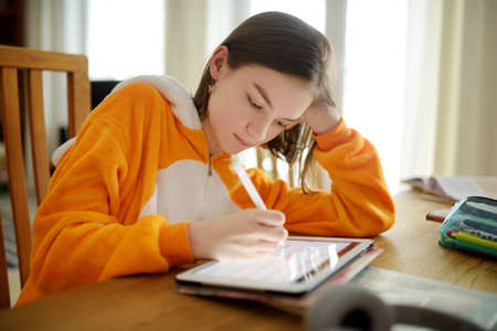 Preteen schoolgirl doing her homework with digital tablet at home. Child using gadgets to study. Education and distance learning for kids. Homeschooling during quarantine. Stay at home entertainment.