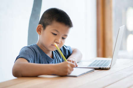 Asian boy learning online education at home with digital tablet and doing school homework. Kid using tablet for searching information on internet,E-learning online education.