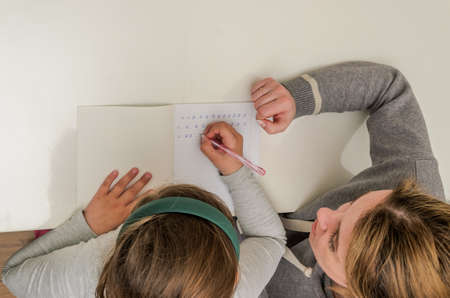 Mom and daughter do school homework, learn to write letters