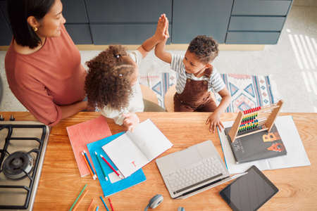 Kids, education and learning of homeschool children high five through early childhood development. Family, mother of young boy and girl above social, communication and teamwork skills with teacher.