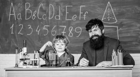 Basic level chemistry knowledge. Study chemistry and biology. Congratulations September 1 holiday. School knowledge. Teacher bearded man and boy chemical laboratory. Happy teachers day. Knowledge day