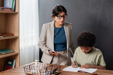 Serious young Hispanic tutor in glasses sttanding at desk and examining task of black boy during individual lesson