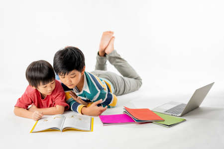 Portrait of Happy asian boys, Brother on floor with laptop and books isolated on white background, Education and learning with technology concept