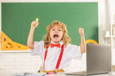 shouting kid boy in bow tie study in school classrrom at blackboard, emotions