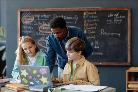 African American Mentor Guiding Diverse Students with Homework and Learning, Multicultural Teacher Helping Girls with Writing and Laptop Use in Modern Classroom