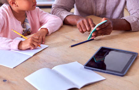 Close Up Of Father Helping Daughter With Home Schooling Sitting At Table With Digital Tablet