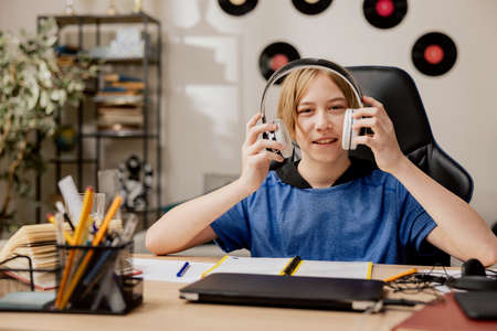 Young boy with blonde long hair sits at desk in modern mens room office teenager is doing homework, preparing for remote learning distance learning classes with teacher putting on wireless headphones.