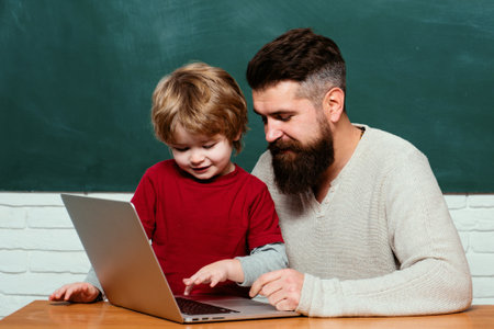 Education and learning people concept - little student boy and Teacher. Young adult concept. Happy family. Parent Teacher. Daddy Teacher. First day in school.