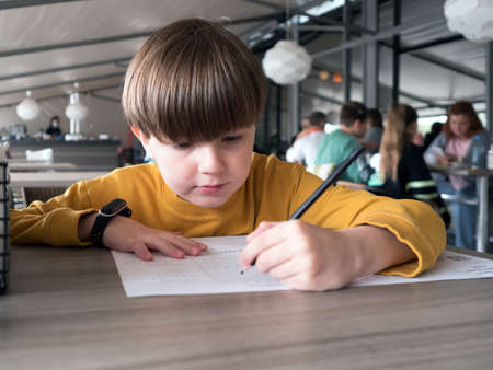Boy is drawing with a pencil sitting at a table in a street cafe.